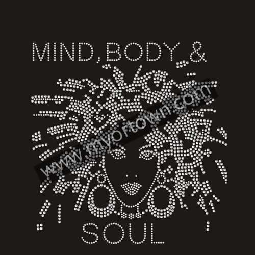 Mind Body and Soul Afro Lady Rhinestone Transfer Motif Iron on Hot Fix Designs for Garment We guarantee Highest Quality Machine Cut 100% Clear Crystal Rhinestones in all of our Rhinestone transfer designs. Print on T-shirts, Tank Tops, Hoodies, Tote bags, Hats, Caps and Fabric etc.